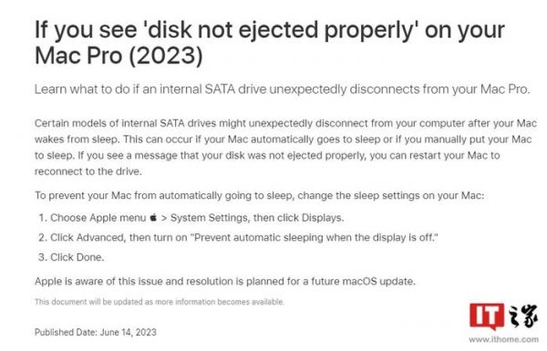 IT之家 6 月 15 日消息,苹果公司今天在一份支持文档中表示,新款 Mac Pro 在从睡眠状态唤醒后,可能会出现内置 SATA 硬盘意外断开的情况。苹果公司表示“已经意识到这个问题”,并将在“未来的 macOS 更新中”修复。