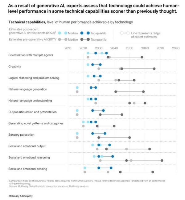 ▲ 图源 麦肯锡在这份报告中,麦肯锡声称“AI 取代人类工作的时间”已经被提前,“新的 AI 采用场景考虑了生成式人工智能的发展,模拟了 2023 年工作活动所花费的时间,在 2030 年至 2060 年间将会有 50% 的职业被 AI 取代,中点为 2045 年,与之前的估计相比,加速了大约十年。”