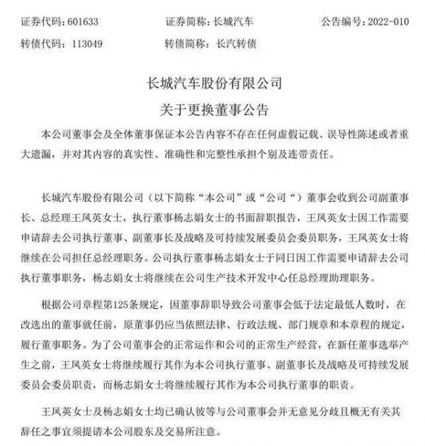 这些问题在长城电动化过程中也不断涌现。2022年初,长城电动化转型压力加剧,魏建军在魏牌的媒体答谢晚宴上炮轰新势力,并声称魏牌的产品没有问题,技术也都是杠杠的,之所以卖得不好,只是因为营销不到位。这也被外界解读为魏建军对王凤英表达不满,而在这次魏建军酒桌失态之后不久,王凤英就正式宣布从长城离职,更令外界浮想联翩的是,长城汽车还在离职公告中补了一句,“王凤英已确认彼等与公司董事会并无意见分歧”。