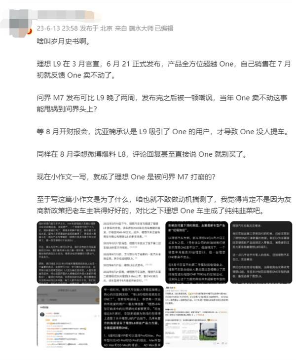 但是,并不是所有人都同意李想的说法。评论区有人质疑M7将理想ONE打垮的事实。他们认为L系列的到来压缩了ONE的生存空间,并且有一些博主发布了更详细的分析。
