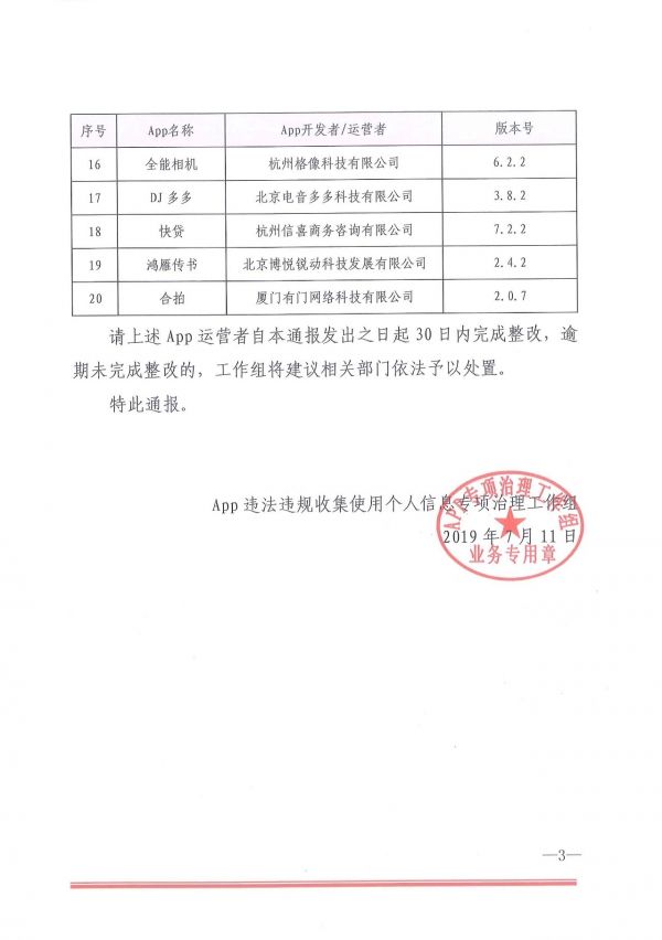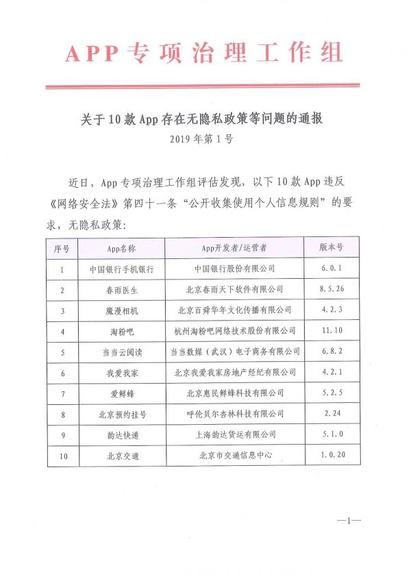 附:7月11日,App专项治理工作组《关于10款App存在无隐私政策等问题的通报》