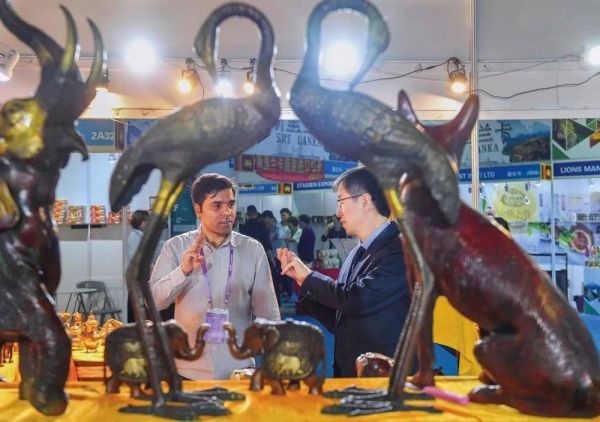 2019 年 4 月 18 日,在福建泉州石狮市举行的第五届中国(泉州)海上丝绸之路国际品牌博览会上,印度客商(左)向顾客推销印度工艺品 宋为伟摄/环球杂志