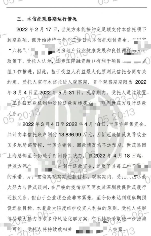这一“观察期”方案很快失效了。中信信托对投资者披露称,“观察期”内世茂方合计向本信托账户划付1.38亿元,但自2022年4月18日起,世茂方停止向本信托账户划付还款资金,违反了其每工作日还款的承诺,并严重偏离观察期还款目标。