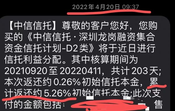 “我收到的最后一次分配信托利益是在2022年4月11日。迄今该产品总共返还了约5.26%的初始信托本金,还有将近95%的本金缺口。”购买了该信托计划-D2类产品的投资者余霜对时代财经表示。