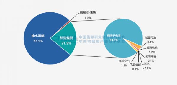 根据中关村储能产业技术联盟(CNESA)全球储能数据库,截至2022年底,我国已投运电力储能项目累计装机规模达59.8GW,占全球25%,年增长率38%。其中,抽水蓄能、新型储能累计装机占比分别为77.1%、21.9%。