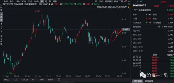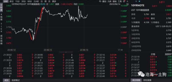 事实上,5月的CPI的确低于预期,预期4.1%,实际4.0%。结果这个信息,变成了美债空头坑杀多头的筹码,十年美债利率一度向下击穿3.7%,之后迅速反弹,向上摸到了3.85%,维持在3.8%附近。