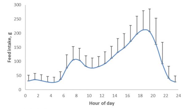 但地位低的猪就没那么好运,它们需要等地位高的猪吃完了才能吃,所以它们在“自然进食高峰期”吃得不足,就只能在其他时段多吃点来进行补偿。
