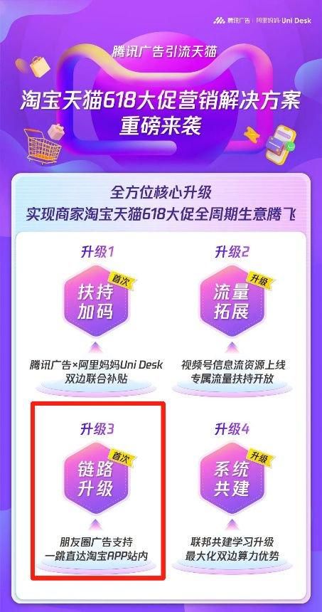 首先是在广告领域,今年618期间,腾讯广告与阿里妈妈Uni Desk首次实现双边联合补贴,并且微信朋友圈首次支持广告一跳直达淘宝APP站内,打通引流到转化的最短路径。