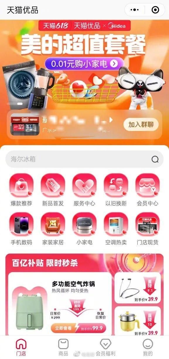 今年5月,天猫在微信上线了一个名为“天猫优品”的小程序商城,主要销售手机数码、家装家居、小家电等3C家电类商品,并同步参与了天猫618大促,推出了百亿补贴、618以旧换新、入户服务专享等一系列活动。