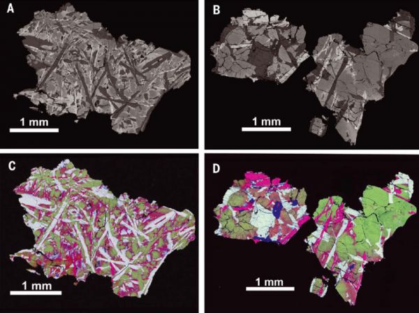 嫦娥五号两颗玄武岩岩屑背散射电子图像(A和B)和元素丰度假彩色图(C和D,硅=蓝色,镁=绿色,铁=红色,铝=白色,钙=黄色,钛=粉色,钾=青色)。来源/车晓超等