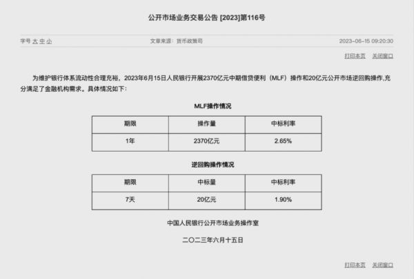 6月15日早间,央行公告,为维护银行体系流动性合理充裕,开展2370亿元中期借贷便利(MLF)操作,中标利率为2.65%,较上次操作下调10基点,下调幅度与短期政策利率相同。