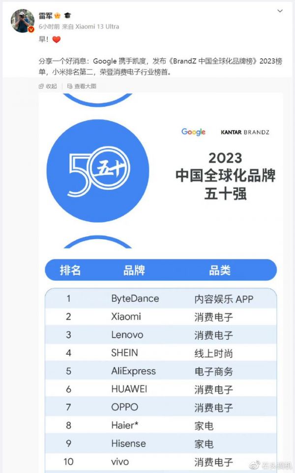 小米13 Ultra在海外获得认可,除了本身产品力足够优秀,还有一个重要的原因,那就是小米品牌影响力得到了全球消费者认可。今天,雷军分享了一个好消息,那就是在《BrandZ 中国全球化品牌榜》2023的榜单中,小米排名第二,如果按照消费电子类来算,小米就是遥遥领先位居第一。