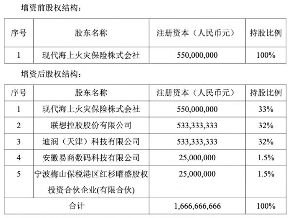 具体而言,此次定增后,现代海上火灾保险株式会社的持股比例将由100%降至33%,但仍为第一大股东;联想控股和迪润科技分别持股32%,同为第二大股东;易商数码和红杉曜盛则分别持股1.5%。