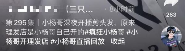 6月16号凌晨,三只羊旗下账号分享了一段小杨哥剪头发的视频,并透露这家理发店原来他自己开的,除此之外,小杨哥还讲述这家理发店背后的故事,以及前段时间为什么空降直播间怒斥于天奇。