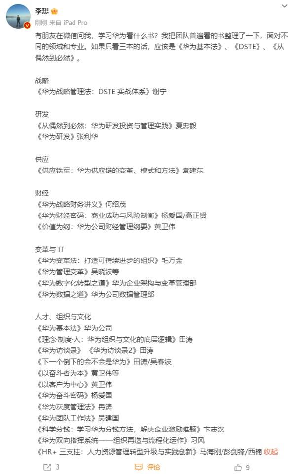 就在今日,李想分享称:有朋友在微信问我,学习华为看什么书?我把团队普遍看的书整理了一下,面对不同的领域和专业。如果只看三本的话,应该是《华为基本法》、《DSTE》、《从偶然到必然》。