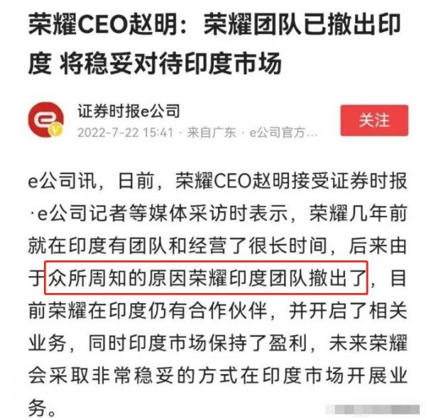 小米被印度冻结48亿资产后,荣耀CEO公开对外回应称,由于众所周知的原因,荣耀印度团队全部撤离,只保留了极少业务,哪怕被抢走也无伤大局。