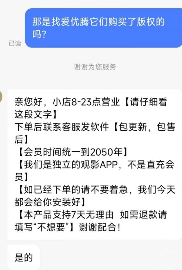 ▲客服人员表示向有关版权方购买了版权。 图片来源/截屏对于APP里的电影电视剧是否向“爱奇艺优酷腾讯芒果等购买版权”一事,客服回答“是的”,还表示APP不会被封禁,如果被封“找我们就可以”。