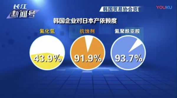 ▲ 2019年,日本宣布对韩加强出口管制,集中在三类化工品,分别是氟聚酰亚胺(Fluorine Polyimide)、光刻胶(Resist)和高纯度氟化氢(Eatching Gas)。图片来源:长江新闻号截图