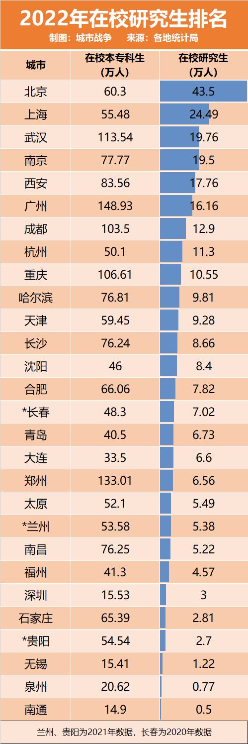 广州、成都的研究生数量分别为16.16万、12.9万,分别排在全国第六、第七。
