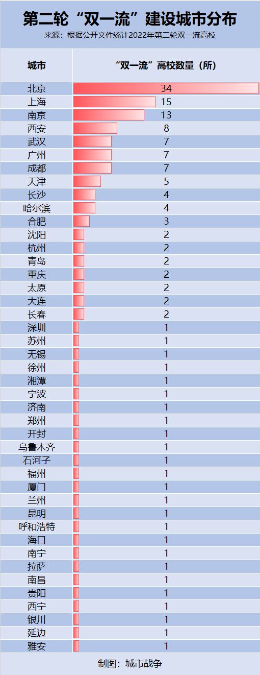 如上图所示,北京、上海、南京是双一流高校最多的城市,紧随其后的是西安、武汉、广州、成都。