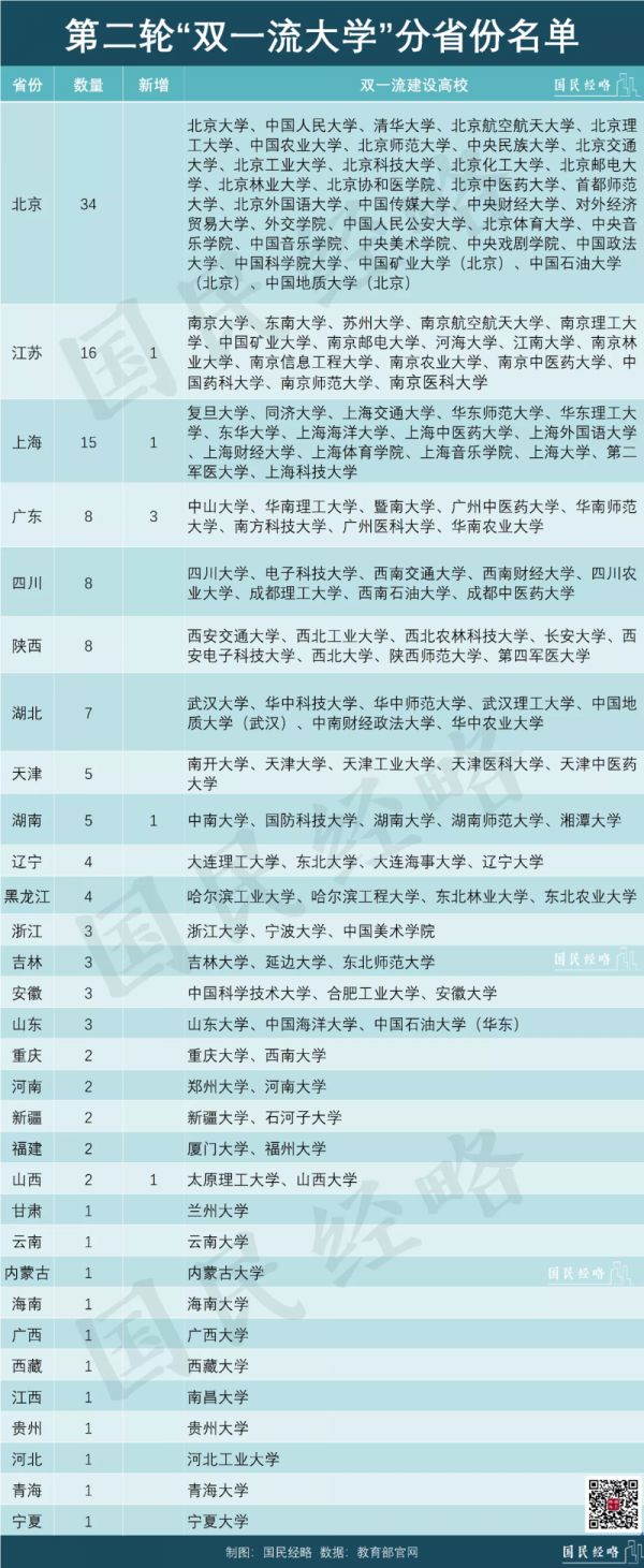 以下为第二轮“双一流”大学名单,共147所大学上榜,下面是省份分布: