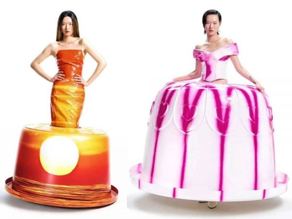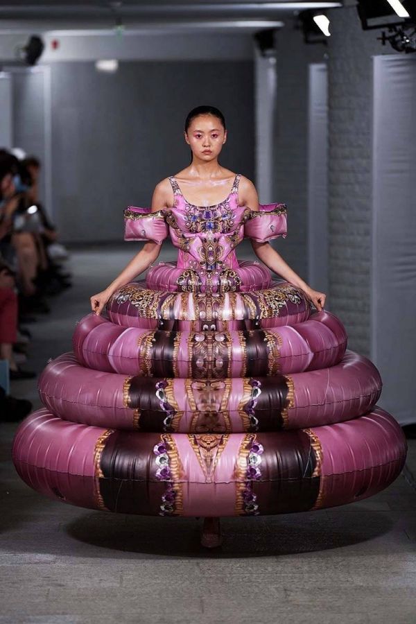 他们做过景区主题,在纽约的秀场上,模特们都拿着自拍杆,营造一种很生活化的感觉;他们做过家的主题,时天回忆起小时候爷爷用大铁盆给自己洗澡,做出了盆一样的鱼尾裙,又印了太阳上去,体现家的温暖;他们看到泳池里的孩子,会套摞着好几个泳圈学游泳,像一条公主裙,于是就做了出来……