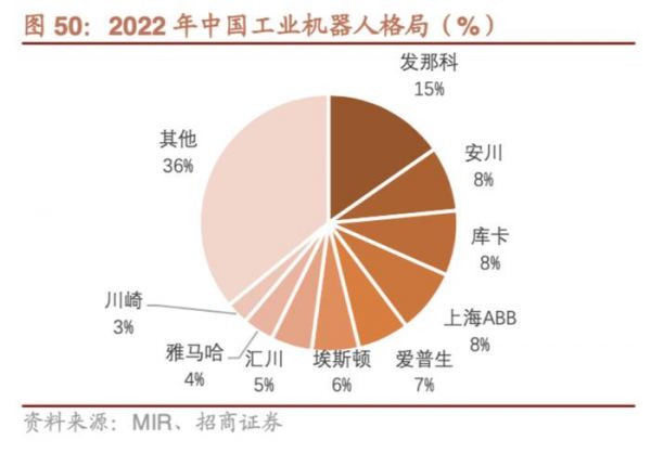长期以来,我国工业机器人的主要市场份额长时间被外资企业占据。招商证券研报显示,2022年被称作“四大家族”的发那科、安川电机、库卡(美的100%持股))和ABB占据40%的市场,本体国产化率在30%左右。不过,在埃斯顿、汇川技术等龙头释放的“头雁”效应下,中国企业正找各种方法予以回击。