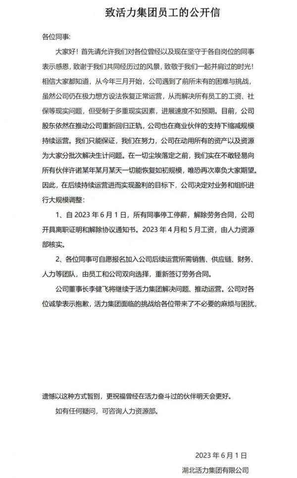 “在后续持续运营进而实现盈利的目标下,公司决定对业务和组织进行大规模调整,自2023年6月1日,所有同事停工停薪,解除劳务合同,公司开具离职证明和解除协议通知书。”
