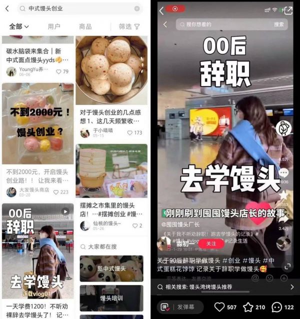 更主要的是,这些馒头店在百度里的搜索信息寥寥无几,而在小红书、抖音等年轻人的聚集地轮番轰炸,而且,宣传的“风格”都非常雷同——“90后辞职学做馒头”“月净收3W的馒头铺”“95后摆摊卖馒头的一天”“00后开馒头店连载”……