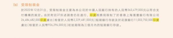 2022年4月,印度执法局指控小米及其印度子公司自2015年起以“特许权使用费”的名义向国外实体进行非法汇款,此举违反了该国1999年颁布的《外汇管理法》的相关规定。据此,小米印度子公司银行账户中的555.13亿卢比(约合48.26亿元人民币)被当局冻结。按照财报公布的信息,在2022年,大约相当于32亿元人民币的卢布已经被冻结。