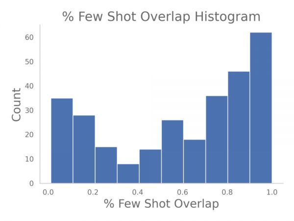 但是在随机扫描已发布的测试数据集时,他们注意到一些奇怪的事情。许多提供给模型的小样本示例几乎与问题本身一字不差,这种重叠情况可以用柱状图来表示: