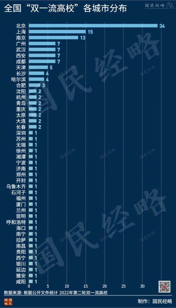 根据第二轮双一流大学名单,北京、上海、南京分别有34所、15所、13所双一流大学,广州、武汉、成都、西安都是7所,而深圳仅有南方科技大学1所。