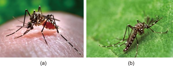 图1. (a) 仅雌蚊会叮咬并传播疾病,图示为雌性埃及伊蚊;(b) 雄蚊因其浓密的触角而有别于雌蚊,图示为雄性埃及伊蚊。来源:美国疾病控制中心(公有领域)。
