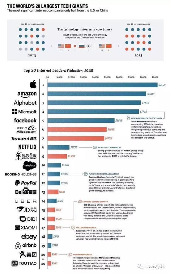 再1说一下世界的趋势。2013年,全球市值最高的美国互联网公司有13家,中国是3家。2018年,美国这个数字变成了12家,中国是8家。贸易战日益加剧,中国与美国关系日益紧张。种种的这一切都表明了中国科技力量的快速崛起。美国对于中国的崛起表现出了更强烈的焦虑和不安。我相信这个趋势会在很长一段时间内延续下去。中国互联网科技行业将在很多层面上逐渐超越美国。短期内的起起伏伏都不重要,要以更长远的眼光来判断趋势。如果趋势真的是这样,我们更应该加入到这个浪潮之中,顺势而为,毕竟许多时候趋势比个人努力会更为重要。