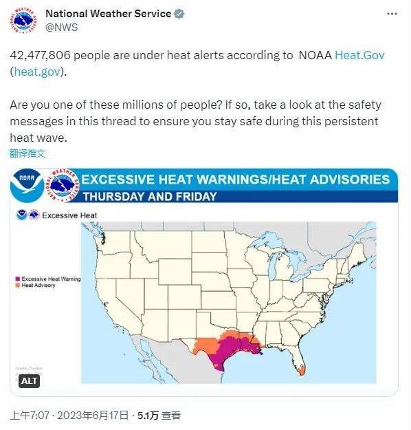据央视新闻,近日,位于美国南部的得州、路易斯安那州、密西西比州和佛罗里达州等多地持续遭遇高温天气。据美国媒体报道,美国有超过4200万人处于高温警报状态之中。根据美国国家气象局发布的消息,墨西哥湾沿岸的美国南部多地,17日遭遇高温天气,得州休斯敦、布朗斯维尔等地体感温度高达46~49摄氏度不等。