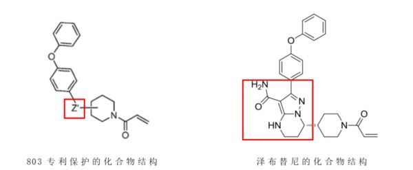 根据Pharmacyclics公司的主张,百济神州泽布替尼的结构通式落在该不可逆BTK抑制剂的结构通式内。医疗保健提供者和患者根据标签指示使用泽布替尼治疗CLL/SLL,直接侵犯了803专利的多项权利要求。