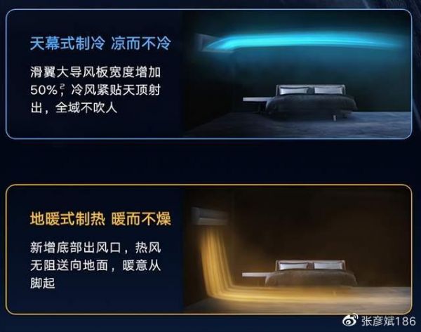 “分布式送风技术”利用冷风下沉、暖风上升原理,为空调设计了两个出风口。制冷时,冷风从上出风口吹出再下沉,实现“淋浴式制冷”,可以避免冷风直吹脖颈、手臂、头等部位,摆脱“空调病”。制热时,热风从下出风口吹出再上升,实现“地毯式制热”,真正做到暖意足下生,热风暖全身。