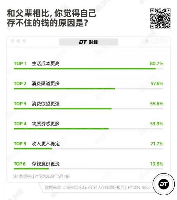 前段时间,“为什么父辈能存到钱”的话题上了热搜,DT财经针对这一问题进行了调研,结果显示,和父辈相比,年轻人存不下钱的原因还在于消费渠道更多和消费欲望更强。