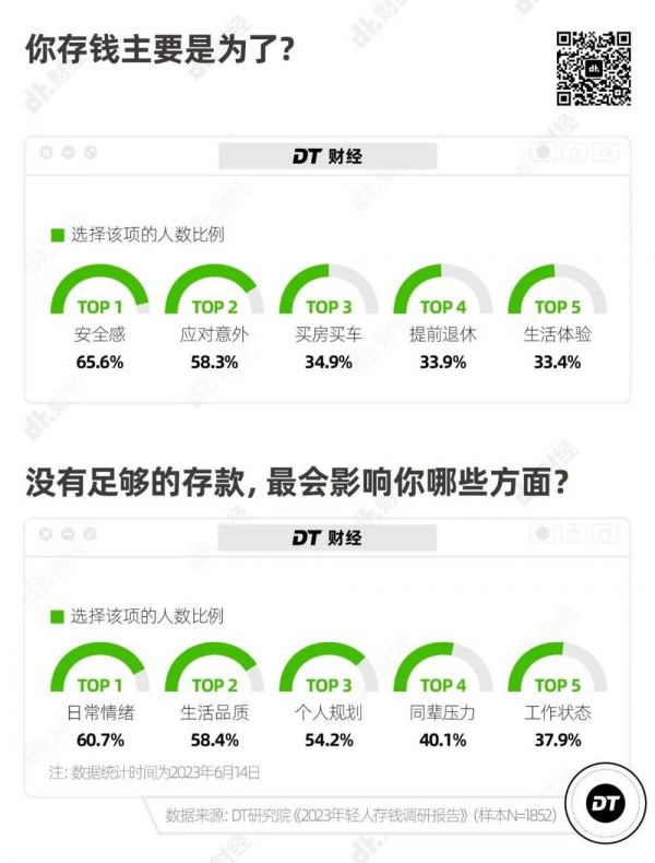 因为年轻人在意当下的生活体验,所以存钱的最大意义不是买房买车、结婚等实际的事,而是获得安全感和应对意外,60.7%的人会因为没有足够存款而情绪不好。