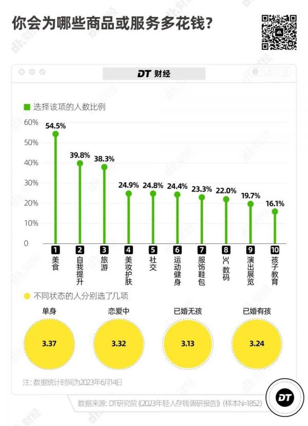 更具体地,年轻人愿意在这些事情上多花钱:美食、自我提升、旅游、美妆护肤、社交、运动健身。这其中,未婚人群(单身和恋爱中)更舍得为不同商品/服务多花钱,平均每个人选择了3.37项和3.32项。