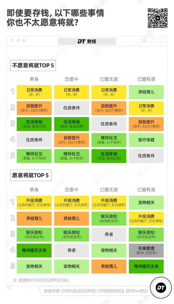 DT财经发现,在为存钱要将就啥/不能将就啥这个问题上,人们的回答和人生状态有很大关系——对于有孩子的人来说,养娃育儿是决不能将就的头等大事,为此可以放弃形象管理、甚至是婚恋关系的维持。