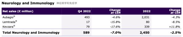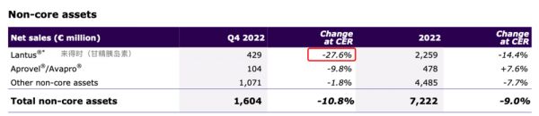 2022年第四季度赛诺菲部分核心和非核心业务板块收入下滑明显。来自赛诺菲2022年财报。