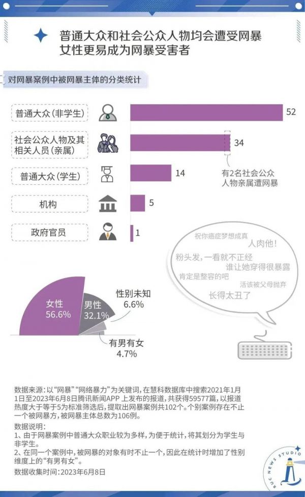 经过编码发现,网暴的受害者超过六成是普通大众。