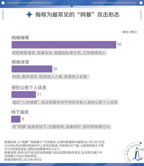 为了回答这一问题,我们搜集了2021年1月1日至今年6月8日期间,报道热度较高的102个网暴案例并进行逐帧拆解,看只言片语的恶意,如何步步汇聚,最终成为庞然巨兽。