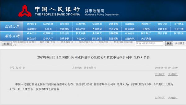 6月20日,央行授权全国银行间同业拆借中心公布,最新一期贷款市场报价利率(LPR)为:1年期报3.55%,5年期以上LPR报4.2%,均较上一期下调10个基点。