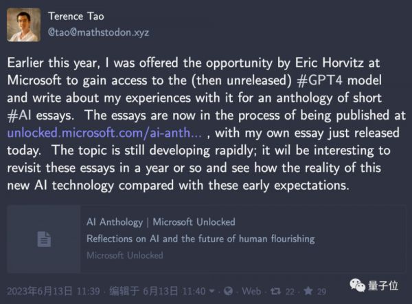 数学家陶哲轩刚刚自曝,在GPT-4发布之前就从微软那里获得了访问资格。