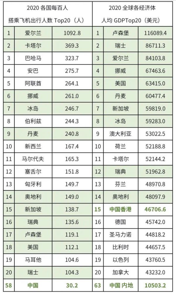 人均乘机次数和人均GDP有明显关系。中国内地的人均GDP在2020年为10503.2美元,排名全球第63,和人均乘机次数的第58名基本相当。