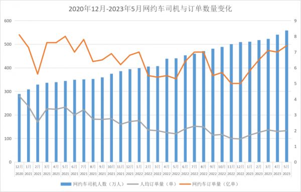 然而,司机群体不断扩大的同时,网约车总订单量却并无明显的增长。根据网约车监管信息交互系统统计,2020年12月网约车订单量为8.1亿单,2023年5月网约车订单量为7.4亿单,反而还下降了。
