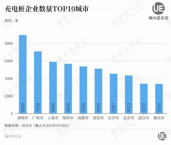 也就是说,全国每10家充电桩企业广东就有一家半。具体到城市而言,广东深圳、广州分别以8926家、7058家领跑全国,也主要是受益于其更加贴近用户和市场。