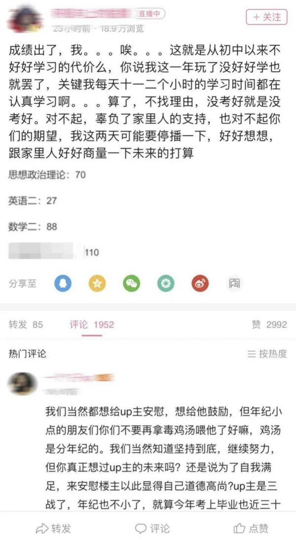 “我考研到十一月有一阵真的太不想学了,很不自觉好想玩手机,就想着开个直播叫网友监督一下我,如果看见我玩手机就骂我,但是有两仨人看我不说我还要考虑他们的观感,一会调调光一会调调角度啥的,根本不能静心学习,两天就放弃了老老实实刷题去了。”